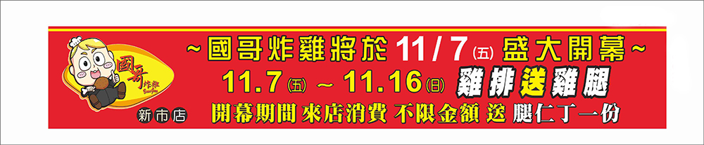 香氣四溢、酥脆登場!國哥炸雞新市店將於 11/7 盛大開幕 開幕期間(11/7~11/16)買雞排送雞腿來店消費不限金額,即送【腿仁丁】乙份! 快揪朋友一起來嚐鮮,酥脆多汁好滋味等你來嗑!